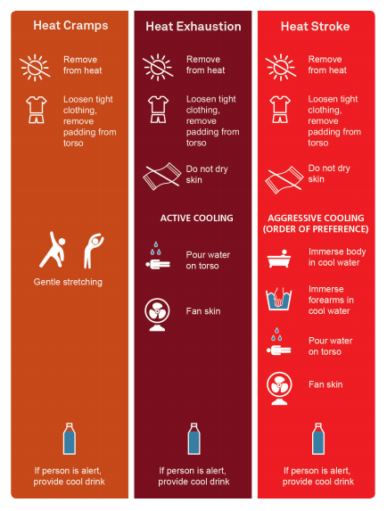 Heat Exhaustion: Occurs when the body begins to overheat typically due to loss of fluids and electrolytes greater than what the body is taking in. This is an early indicator that the person’s body temperature regulating system is beginning to be overwhelmed. If not managed this can lead the life threatening heat stroke. As more blood flows to the persons outer body the help cool the core the person may experience shock like symptoms including flushed red skin turning to pale or grey, fatigue, nausea, dizziness, headache, excessive thirst, fainting and as the name indicates complete exhaustion. First aid guidelines include:
